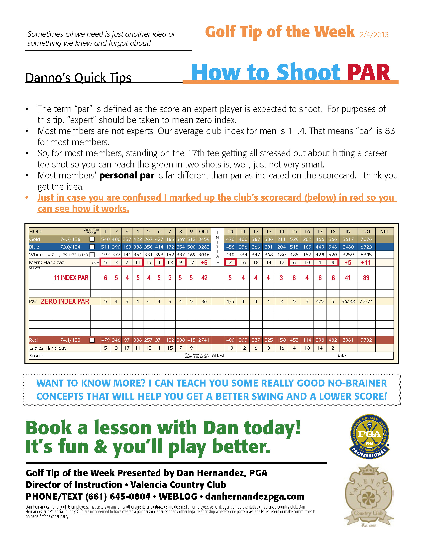 I never posted this at danhernandezpga.com but it was available to members as a download back in February. I thought I would share it now with everybody. Basically, it’s all about being smarter when you play golf and being realistic about your ability. There are PGA TOUR players and then there’s the rest of us. Want a lower score? Play to your personal par and forget about 72 – unless you’re about a +1.